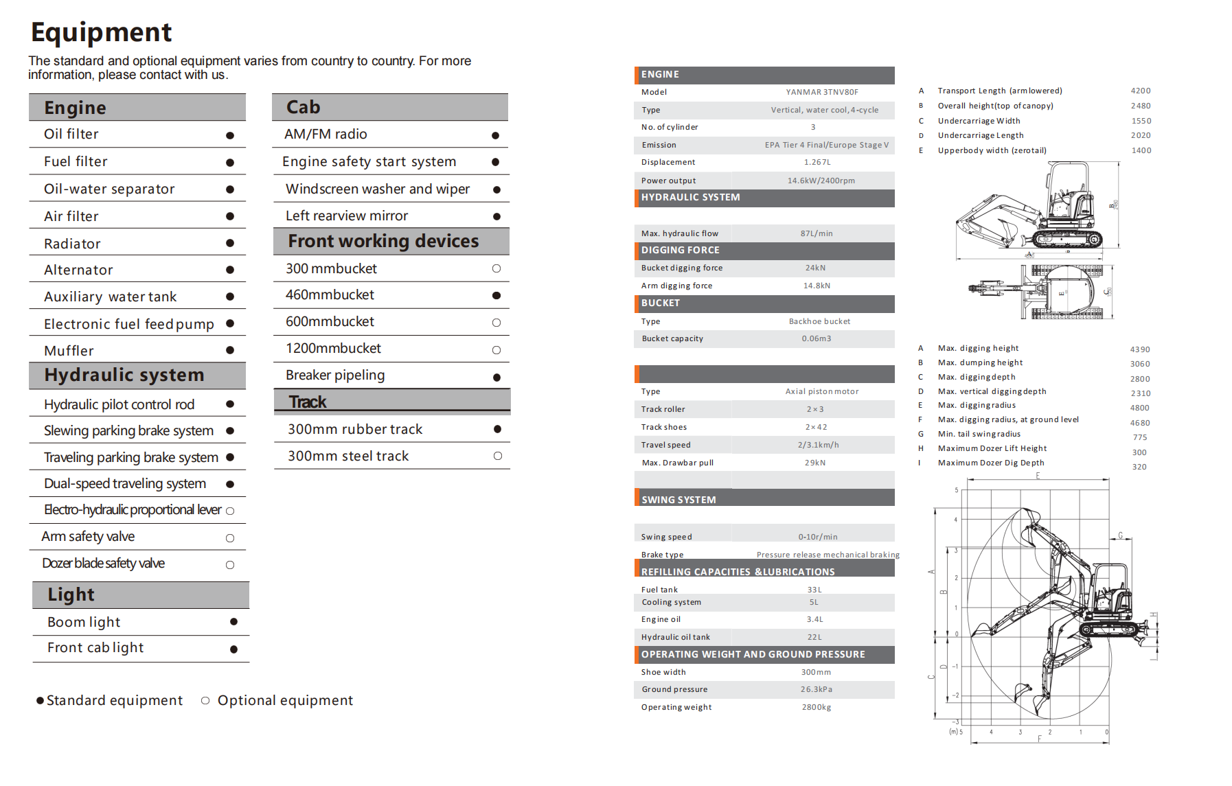 | Max digging depth | 2.800 mm (110 in) |