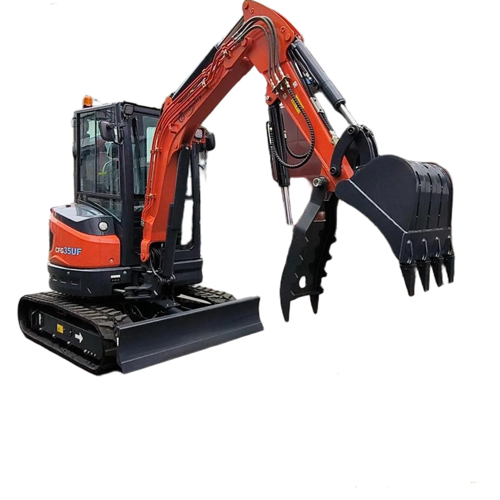 The CFG-35UF is a powerful and versatile compact excavator built for demanding applications in utility work, landscaping, road maintenance, and light industrial projects. Powered by a reliable Kubota D1105 3-cylinder diesel engine, it delivers excellent fuel efficiency and smooth hydraulic performance. With pilot-controlled joysticks and an advanced piston pump hydraulic system, the CFG-35UF ensures precise, responsive operation across a wide range of attachments.