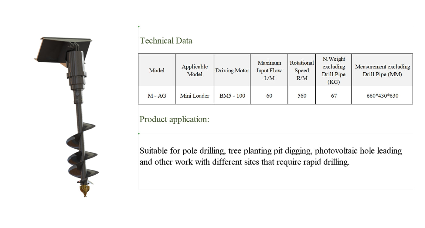 Compatible with a variety of auger bit sizes for different applications。Heavy-duty gearbox and motor for long service life Quick-attach system for fast, secure connection Rugged construction to withstand demanding jobsite conditions Low maintenance design with easily replaceable wear parts
